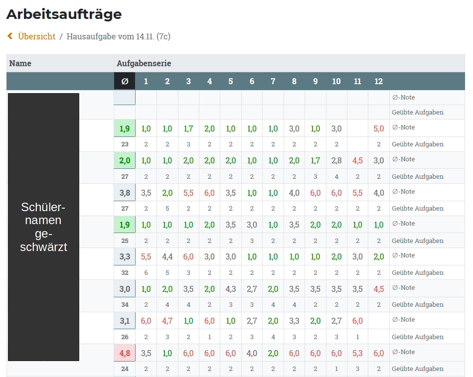 - Informieren Sie sich in den Auswertungen darüber, welche Schüler welche Aufgaben bearbeitet und wie sie dabei abgeschnitten haben.