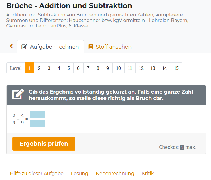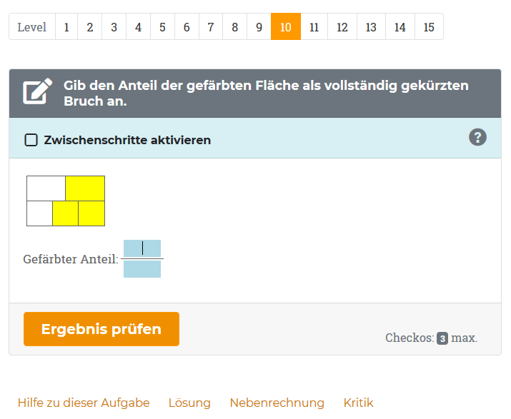 - Zu jedem Thema gibt es verschiedene, unterschiedlich schwere Aufgaben, in mehrere Level unterteilt.