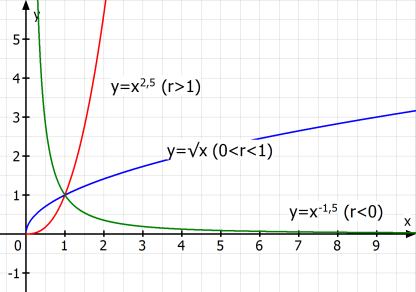 • 0<r<1: ähnlich dem Graph der Wurzelfunktion y = √x. Prägnante Erkennungsmerkmale: nur für x≥0 definiert, streng monoton steigend, für große x ins Unendliche wachsend, aber mit nachlassender Steigung. Je größer |r|, desto schneller geht der Graph für große x-Werte nach oben.