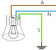 Jemand hat eine Lampe mit metallischem Schirm mit dem Außenleiter(A), Neutralleiter(N) und Schutzleiter(S) angeschlossen.