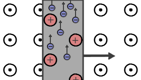 • Bewegt sich ein gerader Leiter quer zu den Feldlinien eines homogenen Magnetfelds, bewirkt die Lorentzkraft auf die Elektronen eine Ladungstrennung im Leiter und damit eine (Induktions-)Spannung.